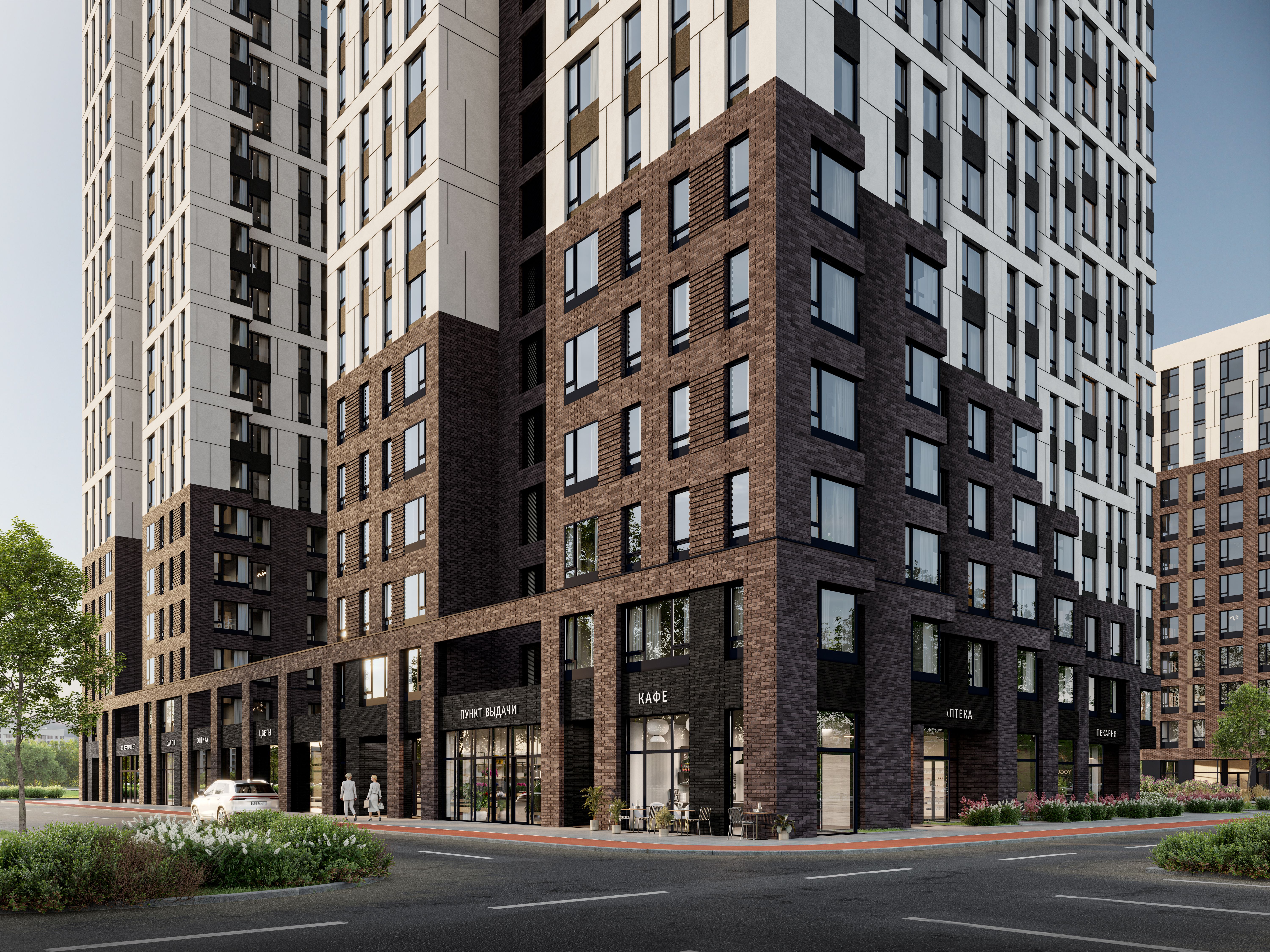 Архитектурная концепция продиктована близостью к берегу Туры: каскадное снижение высоты зданий к воде обеспечивает панорамные виды, а на южной стороне с 21 по 24 этажи реализовано ступенчатое террасирование. В домах предусмотрены дизайнерские парадные с доступом к лифтам из паркинга и мусорокамерами. Первый этаж занимает торговая галерея из 34 помещений площадью от 36 до 149 кв. м с панорамным остеклением и потолками 4,2 метра, что формирует полноценную зону сервисов внутри квартала. Ввод объекта в эксплуатацию запланирован на 2 квартал 2028 года.