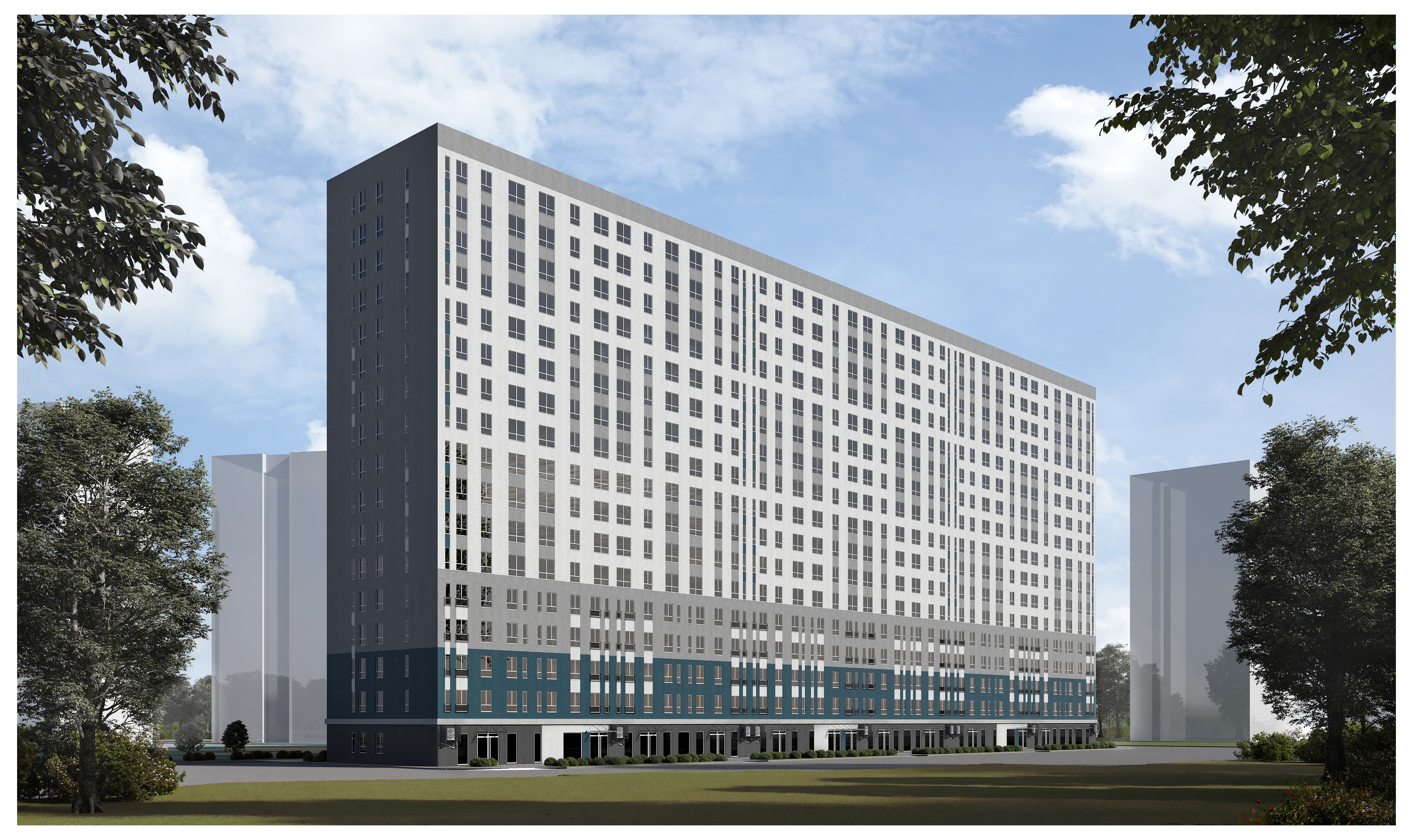 Архитектура комплекса дополнена безбарьерной средой с пандусами, а первые этажи отведены под коммерческие помещения, формирующие внутреннюю сеть магазинов, аптек и сервисов непосредственно в периметре микрорайона.